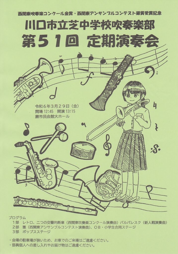 今月3月29日(金)蕨市民会館にて、芝中学校吹奏楽部による第51回定期演奏会が開催されます。