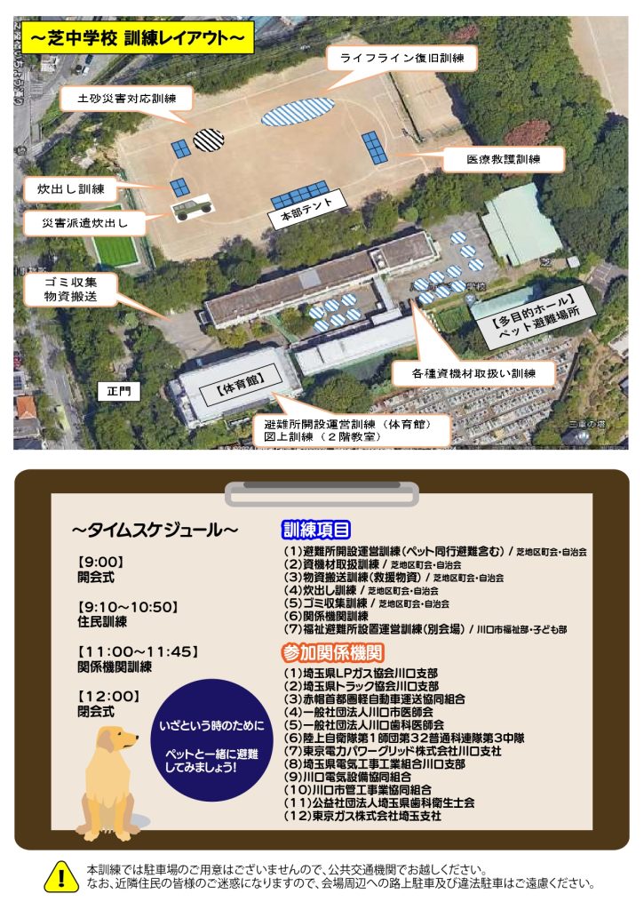 会場となる芝中学校では、芝地区の町会・自治会等が中心となり、実災害の対応に則した各種訓練を実施します。