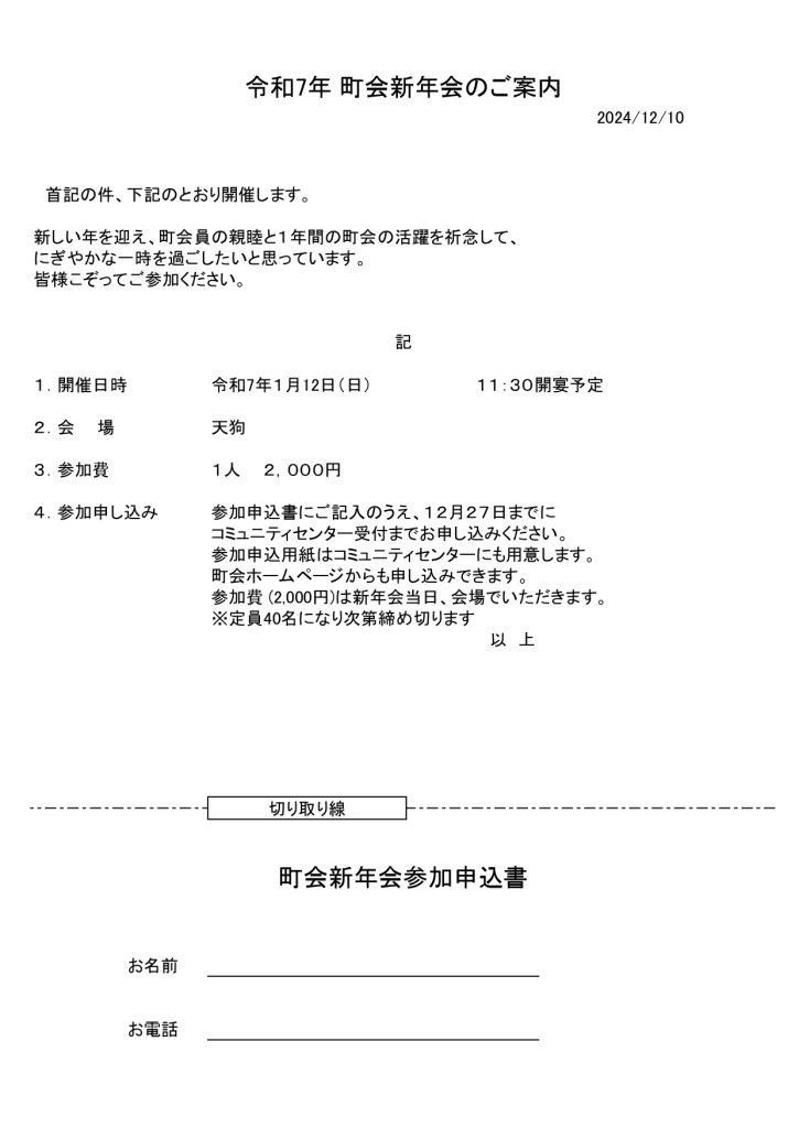 【12/27締切ました】令和7年 町会新年会のご案内